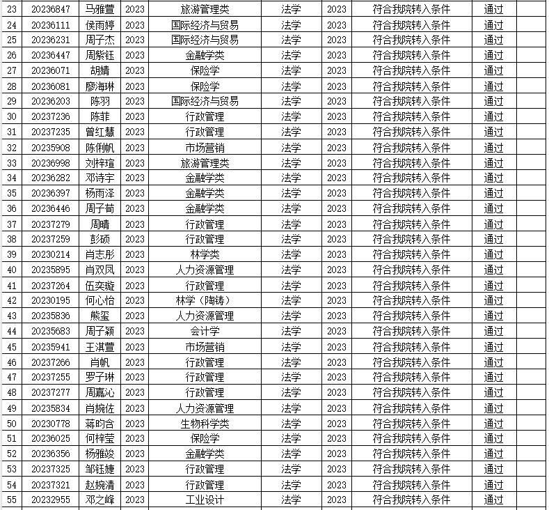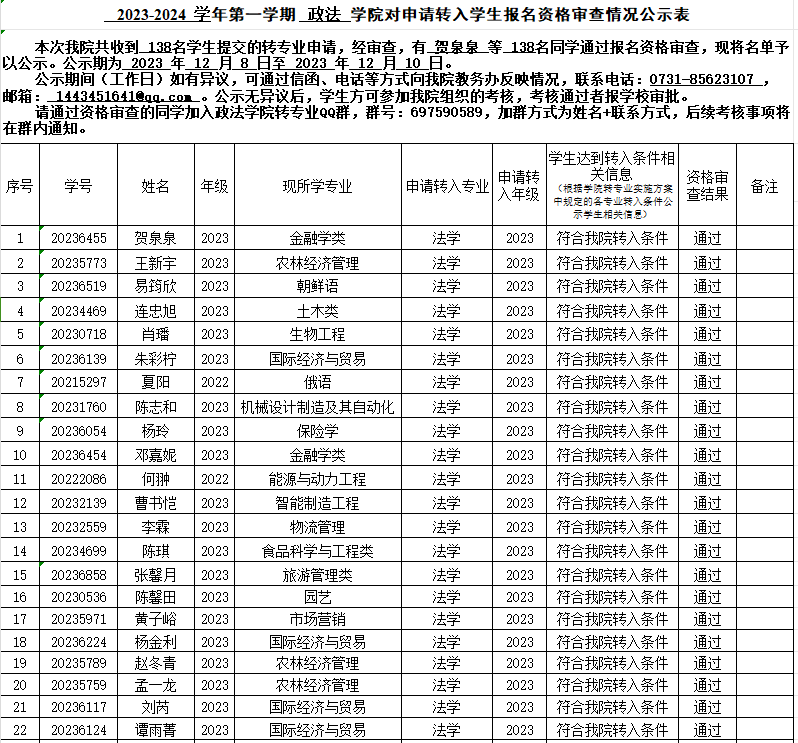 本次我院共收到138名学生提交的转专业申请,经审查,有贺泉泉等138名同学通过报名资格审查,现将名单予以公示。公示期为2023年12月8日至2023年12月10日。