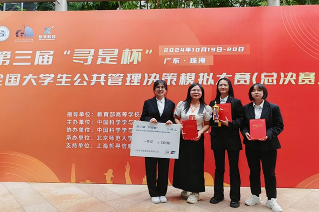 2024年10月19至20日,第三届“寻是杯”全国大学生公共管理决策模拟大赛(总决赛)在北京师范大学(珠海校区)成果举办。由我院曹芳老师、罗双老师带队,行政管理专业本科生徐思洁、罗嘉、向荣所组成的求是求新队,经过方案设计、沙盘对抗、现场答辩三个环节的激烈角逐,在大赛中荣获全国一等奖,两位指导老师获评“优秀指导老师”。