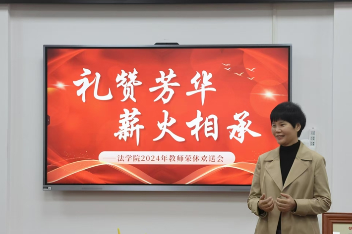 湛念老师表达了对领导、老师和同学们的感激之情,感谢他们多年来的帮助和支持。她认为法学院是一个温暖的大家庭,即便离开了工作岗位,与学院的联系和情谊将会永远铭记在心,这些都是她教育生涯中宝贵的财富。并表示会继续关注学校的发展动态,为学校的进步贡献自己的力量。