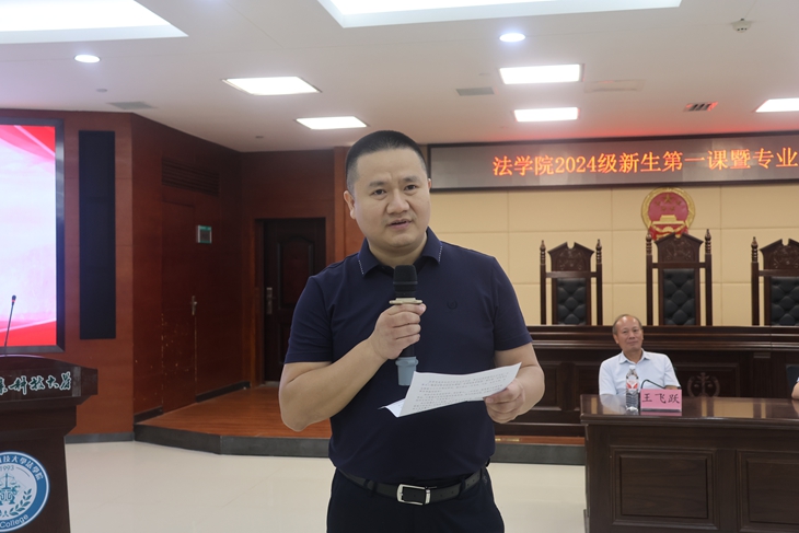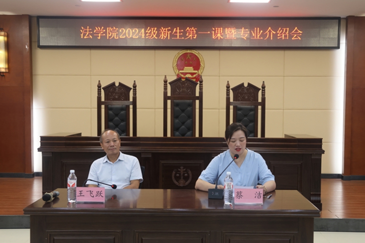 2024年9月13日晚7点,法学院2024级新生第一课暨专业介绍会于博文楼模拟法庭顺利举行。党委书记蔡洁、院长王飞跃、党委副书记梁旭、副院长曹芳、副院长张小罗、法学系主任黄娟、知识产权系主任邓毅沣、2024级新生班主任及学工办蔡卓、于智超、谢理玥出席了本次会议,2024级全体本科生参加会议。新生第一课由学院党委书记蔡洁主持。