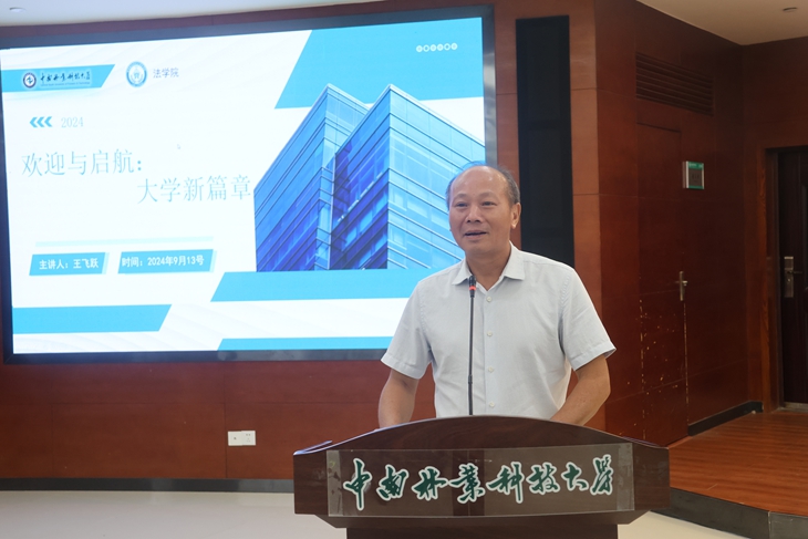 大会第五项,王飞跃院长为2024级新生讲授开学第一课。首先,他对2024级新生的加入表示由衷祝贺。其次,他从办学历程、学科建设、师资力量、特色活动、育人成效、校友发展和我们的朋友圈等方面为同学们上了生动精彩的一课。再次,他从为人、为事、为学三方面的“变与不变”浅谈其对大学生活的理解,强调大学生培养自我管理、独立判断能力,提高情绪管理、危机防范意识的重要性。最后,他向2024级新生表示:“你的笑容,是学院的光荣;你的成长,是学院的希望”,祝愿大家在大学中能有所成长和收获。