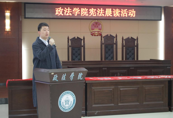 活动在雄壮的国歌声中开始。首先由政法学院团委书记于智超讲话,他指出,宪法作为我国根本大法,在我国法律体系中的重要地位,表达了对政法学子学习宪法知识,树立宪法权威的要求和期望,希望政法学子“争做学法、懂法、守法、用法、护法的新时代大学生,从自己做起,从小事做起,为新时期中国特色社会主义法制建设添砖加瓦”。