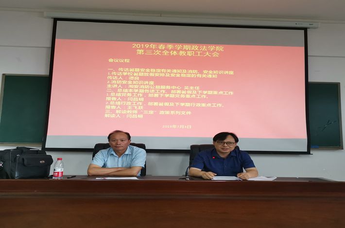 根据会议安排,谭良副院长传达学习了学校关于安全稳定的有关通知精神和暑期放假安排,并邀请了湘安消防公益服务中心的警官为政法学院教职工进行了消防安全知识讲座。闫昌明书记和王飞跃院长分别就上学期党务工作和行政工作做了总结发言,并对暑期的工作安排和下学期学院各项重点工作作了精心部署。另外,利用本次大会机会,闫昌明书记专门对学校近期发布的教师定编、定岗、分类管理、定责与考核系列文件进行了政策解读。会议取得了良好效果。