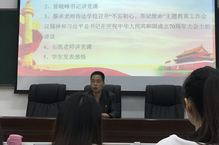 法学学生党支部书记石凯以“高校思想政治辅导员的初心和担当”为题进行感受分享,行政管理学生党支部书记蔡卓传达了学校召开“不忘初心、牢记使命”主题教育工作会议精神,并领学“习近平总书记在庆祝中华人民共和国成立70周年大会上的讲话”;学生党员代表白晨、雷楠楠、任含璋发表了主题教育的学习体会。