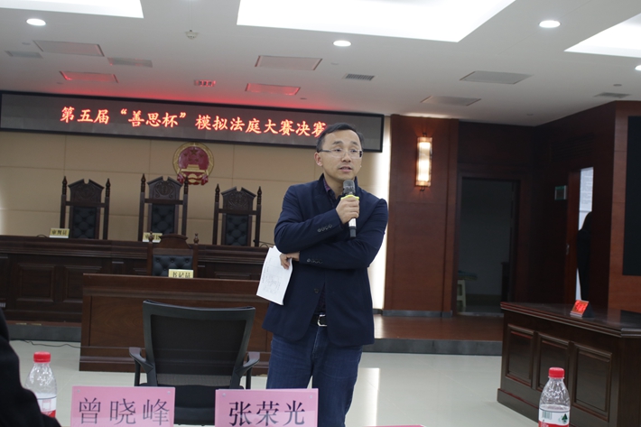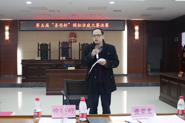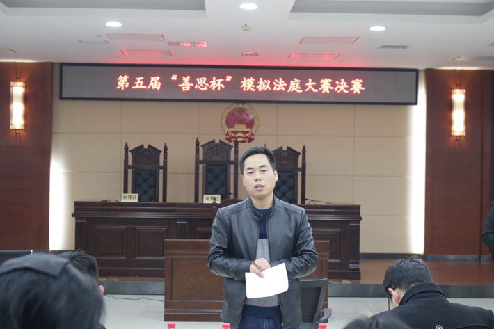 2019年4月,由法学协会举办的第五届“善思杯”模拟法庭大赛顺利拉开帷幕。通过提交文书和模拟开庭,为在校生提供了一个检验控辩技巧的机会。经过初赛和半决赛,决赛于4月12日在博文楼模拟法庭举行。政法学院党委副书记曾晓峰、辅导员石凯、校学生会代表参加本次活动。政法学院副教授阳永恒、湖南五之律师事务所主任张荣光先生、第四届湖南省大学生模拟法庭竞赛团体二等奖获得者乔亚俊学姐、第四届大学生模拟法庭竞赛个人最佳辩手王昕学长、法学协会会长李鋆昳霏担任评委。