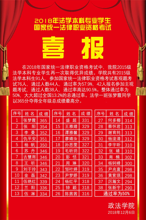 (文/贺翔、乔亚俊)2018年11月30日,国家统一法律职业资格考试成绩公布,我院2015级法学本科生取得了骄人成绩。2015级法学本科生共91人,有76人报名参加国家统一法律职业资格客观题考试,44人通过,通过率为57.9%,远超全国30%的客观题通过率;随后,42人报名参加国家统一法律职业资格主观题考试,38人通过,通过率为90.5%,学院国家统一法律职业资格考试通过率则为50%,远超全国13.2%的总通过率。