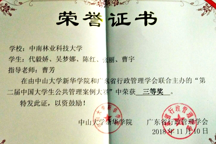 我校政法学院曹芳副教授带领学生组成“林科大的林”队参加大赛,团队经过反复讨论、确定选题,并经过暑假两个月两次去当地调研访谈、实地考察、收集资料、认真撰写参赛案例。参赛案例《“绿色存折”破解农村垃圾治理关键问题——农村垃圾分类的津澧模式探索与实践》荣获全国三等奖。