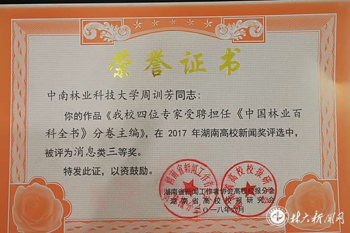 近日,由中国高校校报协会湖南省分会、湖南省新闻工作者协会高校报分会、湖南省高校校报协会联合主办的2017年度“湖南高校新闻奖”评选结果揭晓,我院周训芳教授的作品《我校四位专家受聘担任《中国林业百科全书》分卷主编》荣获消息类三等奖。