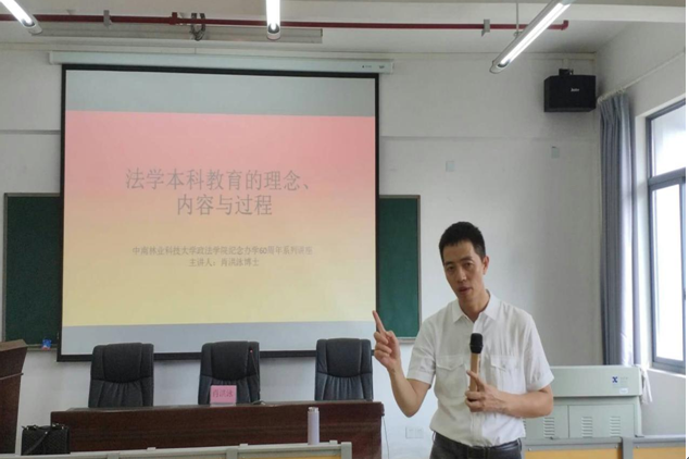 (文\刘宇琪)2018年9月14日,为纪念中南林业科技大学办学60周年,中国人民大学法学博士、湖南大学法学院副教授、硕士生导师、湖南大学罗马法系研究中心私法研究所所长肖洪泳应中南林业科技大学政法学院邀请在博文楼南1105举行了《法学本科教育理念、内容与过程》的学术讲座。2016级法学本科生参加了本次讲座。讲座由我院宁洁老师主持。