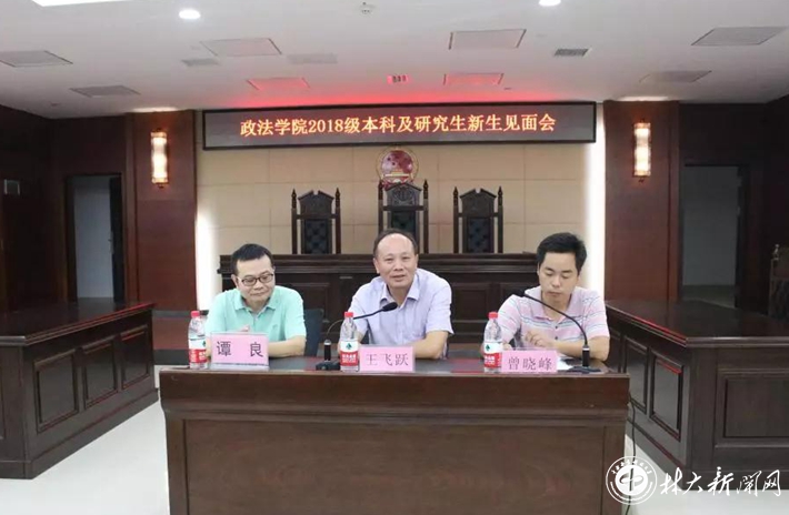 9月17日晚,政法学院2018级本科及研究生新生见面会在博文楼模拟法庭举行,学院院长王飞跃、副院长谭良、法律系主任阳永恒、行政管理系主任熊玲君、新生班主任、辅导员参加会议。党委副书记曾晓峰主持会议。