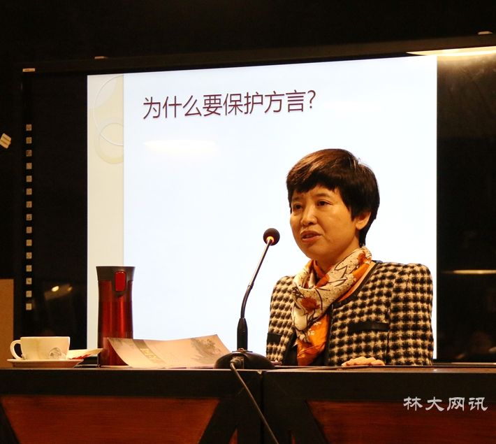 胡萍教授的讲座以方言的保护作为理论切入点,提出语言保护的重大意义。她首先以大量生动有趣的图片引导听众感受少数民族地区丰富的民族和地域文化,接着,以《两个人的村庄》所揭示的农村空心化现象,引出中国方言面临的濒危局面,提出现阶段我们应该做出的努力:首先要转变将语言仅仅视为交流工具的观念,深入了解语言资源与文化的关系。率先行动并积极响应国家号召,全面、真实、科学地将濒危方言记录下来。最后分别介绍了语言资源保护项目的定位、特色、规范以及湖南省积极的态度和所做努力。