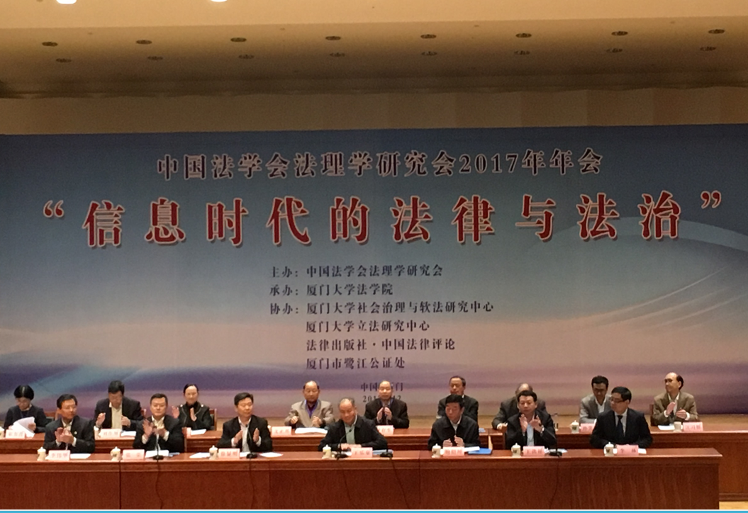 2017年12月3日至4日,由中国法学会法理学研究会主办、厦门大学法学院承办的中国法理学研究会2017年学术年会暨“信息时代的法律与法治”学术研讨会在厦门大学召开。中国法学会会长王乐泉同志,中国法学会党组成员、副会长兼秘书长鲍绍坤同志,最高人民检察院副检察长、中国法学会副会长、中国法学会法理学研究会会长徐显明同志,福建省委常委、政法委书记王洪祥同志,厦门大学校长张荣同志,中国社会科学院法学研究所所长、学部委员、中国法学会副会长、法理学研究会常务副会长李林同志,厦门市委常委、政法委书记、厦门市法学会会长李伟华同志,福建省法学会专职副会长何晓清同志,高等院校专家学者和法律实务部门的有关同志三百多人参加本次会议。我院姜素红教授和2015级研究生张可向大会提交了论文,并应邀出席会议。