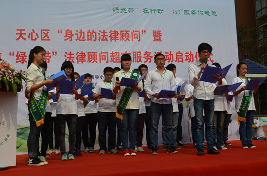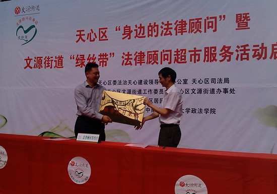 4月18日下午,天心区“身边的法律顾问”暨文源街道“绿丝带”法律顾问超市服务活动启动仪式在文源街道湘翰御舍小区前坪举行,天心区委常委、政法委书记骆正平、副区长、公安局长胡林辉、文源街道负责人等出席,我院周训芳院长、朱朝晖书记等院领导以及法学专业教研室主任雷鑫等6名老师、法学协会30多名同学参加。
