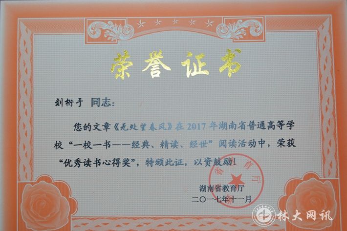 11月22日,湖南省普通高校图书馆馆长年会在衡阳召开,会议对2017年湖南省普通高校“一校一书——经典、精读、经世”阅读推广活动进行了总结表彰。我校师生在此次活动中获得良好成绩。其中,我院研究生韩晓玥、2015级行政管理2班刘桁于、2015级行政管理1班孙曼同学荣获 “优秀读书心得奖”。