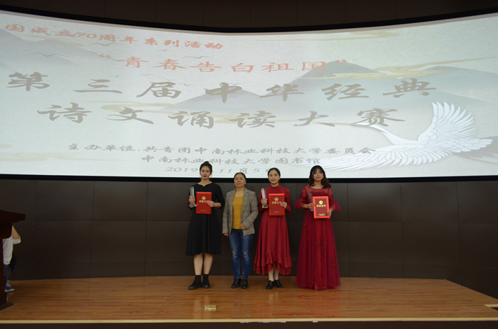 11月5日晚7点,中南林业科技大学“青春告白祖国”第三届中华经典诗文诵读大赛决赛于图书馆报告厅举行。我院2018级法学三班史庆龙、2019级法学一班李雨萌、2019级法学二班张业岱和2019级行政管理二班王慧敏四位同学作为政法学院参赛代表参加了本次比赛。