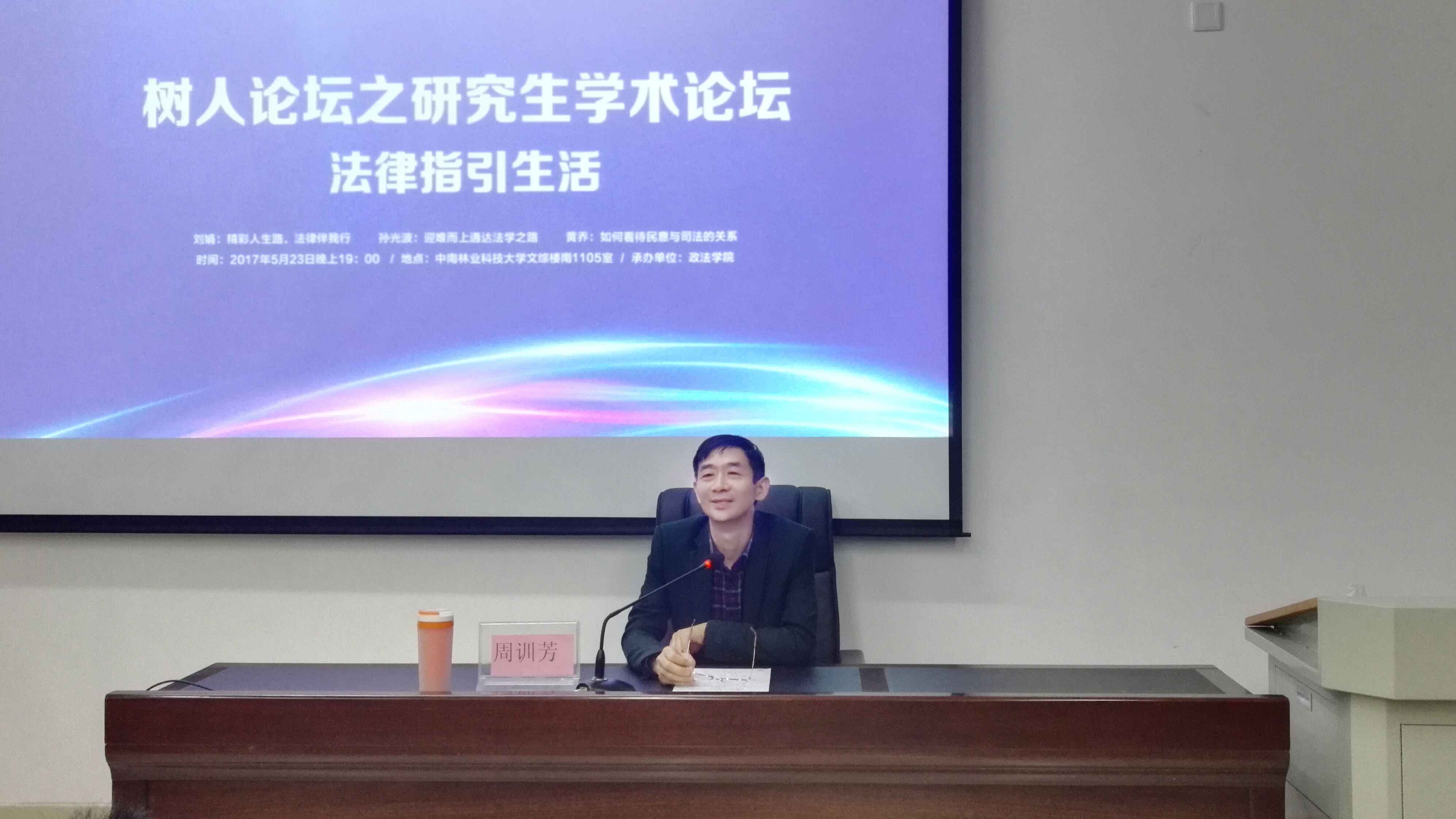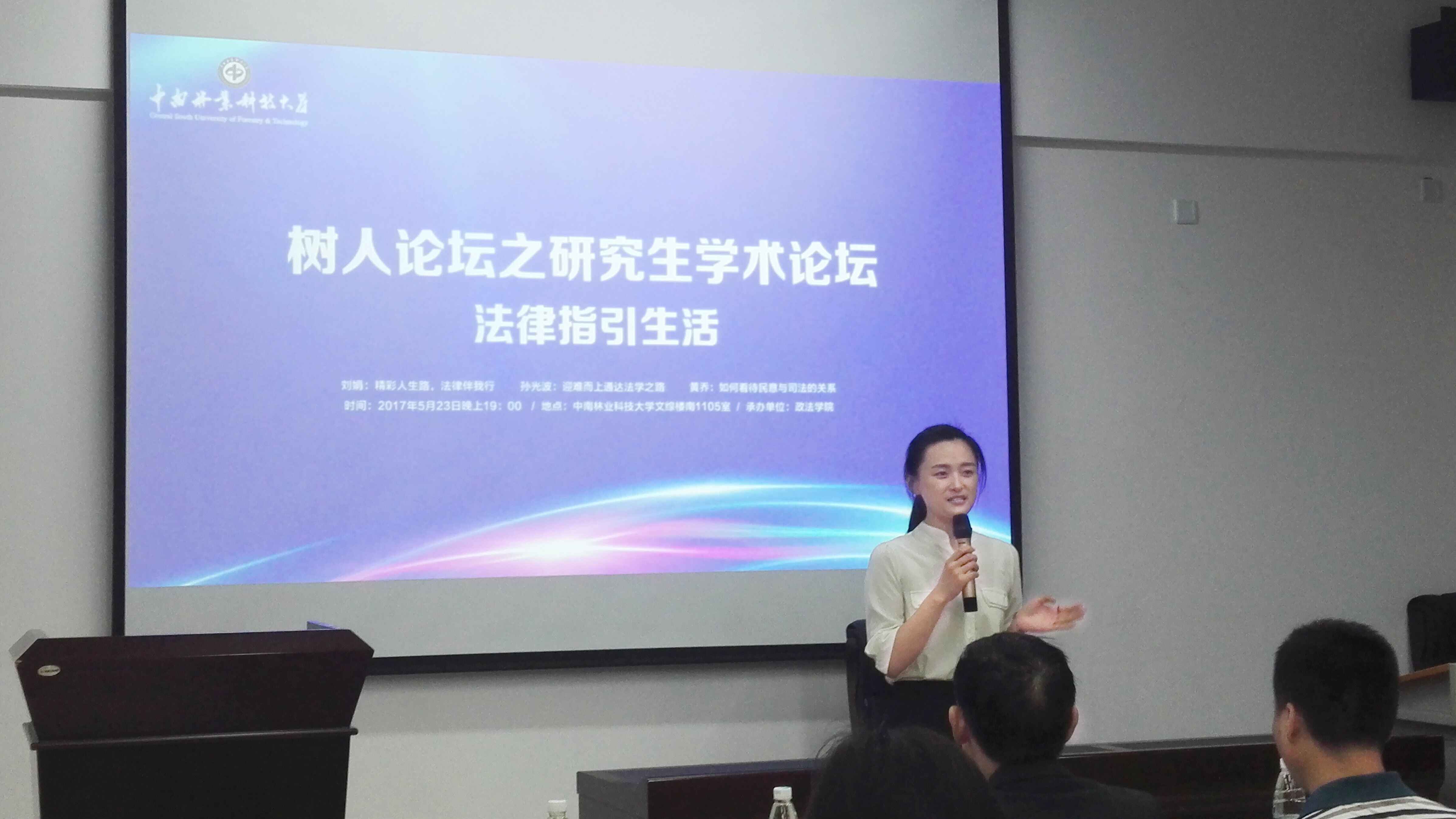 5月23日,由研究生工作部主办,政法学院承办的“树人论坛”之研究生学术论坛在文综楼1105教室顺利举行。本次论坛由2015级法学专业研究生姜兆盼主持,优秀毕业研究生代表2014级法学专业的刘娟和孙光波以及2015级法学专业的黄乔担任主讲,政法学院院长周训芳担任点评嘉宾。政法学院党委副书记曾晓峰以及雷鑫、向佐群、王蓉老师和同学们一起聆听了精彩的报告。