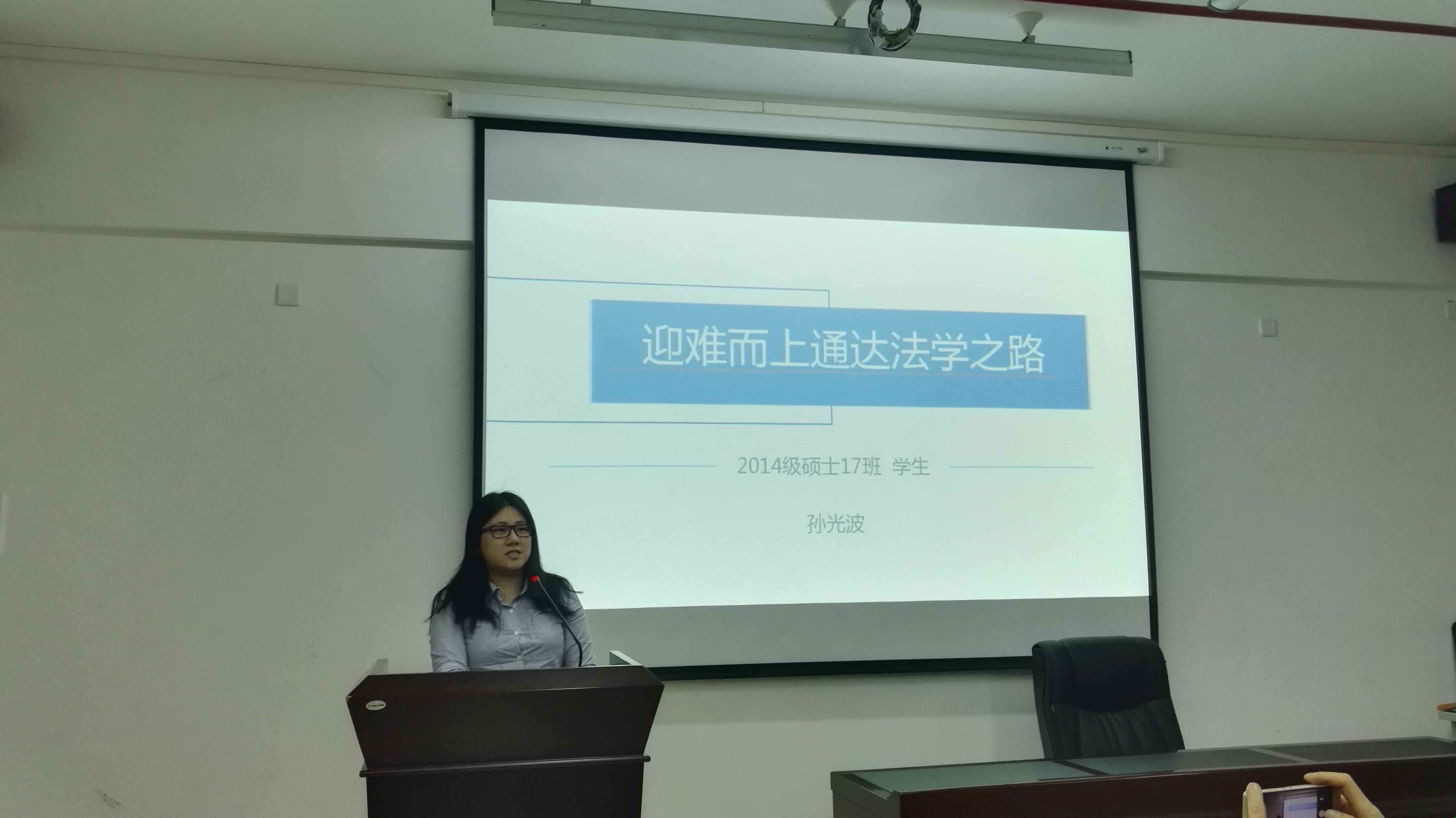 “迎难而上通达法学之路”是孙光波报告的主题。她的分享侧重于论文写作,讲述了自己在撰写毕业论文时遇到的困难和如何解决这些难题。她说,当初选择“自然资源资产离任审计”作为论文选题时就有老师提出这个题目不好写。一来缺乏外文文献,二来国内法学领域对此研究甚少,几乎无资料可查。但是,孙光波依然坚持自己的选择,积极查阅十八届三中全会后相关领域的专家讨论和会议资料,逐步搭建起自己论文的框架。与此同时,她还成功申报了省级科技创新课题,在学术之路上取得了一些成绩。孙光波说,论文写作困难时她一度想过放弃或者延期毕业,但正是老师们的支持与鼓励让她重拾信心。她认为写作既要不畏艰难,不投机取巧,又要心怀民生,发现生活中的法律问题。