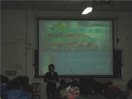 在杜鹃老师的讲演中,她一直言笑晏晏,不仅为在场的同学详细分析了四六级考试的出题方向和应试技巧,更为以后的英语学习进行了指导,无论是在背单词方面、精读方面还是翻译,在杜鹃老师使用风趣的例子中我们受益匪浅,她讲到,学好英语对大学生以后的求职应聘以及生活都有着举足轻重的作用。最后她以自身为例向在场的同学证明了:每个人都能学好英语。