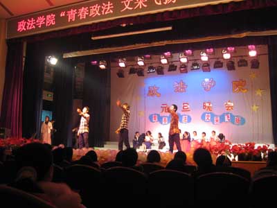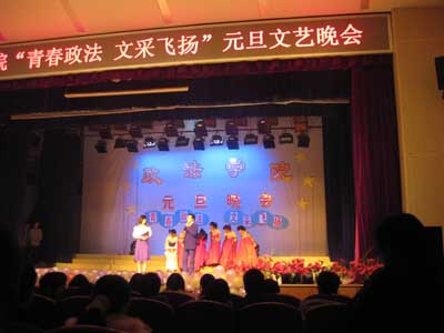 丑旧寅新宏图展,牛归虎跃春意浓。伴随着新春脚步的临近,政法学院2009年“青春政法,文采飞扬”元旦文艺晚会于12月21日晚在校音乐厅隆重举行。莅临本次晚会的校领导有中南林业科技大学副校长秦立春、校党委宣传部部长陈晓文、校学生工作部部长张勖、校团委副书 晚会以政法学院分团委学生会的一个短片开头,在十秒倒计时后正式开幕。晚会首先邀请政法学院周训芳院长致辞。周院长特别感谢各位领导的到来,同时也对学院学子寄予厚望,希望他们在学习生活中 “放飞青春风采、展现政法魅力”。 晚会由政法学院寂静山林吉他协会的乐队开场。08级行政管理专业的男生带来的合唱《嘿,同学》更是令现场气氛火热。此后,街舞表演令全场尖叫一浪高过一浪,将晚会气氛带至高潮。09级新生带来的《天竺少女》让观众对恒河河畔的少女翩翩起舞的想象化为了现实。文艺之星获奖者带来的歌曲串烧,让观众感受到了中外文化的差异,体味到了《70,80,90》的差别。之后,晚会进入游戏环节,一个擦玻璃的舞女动作的“快乐传真”笑爆全场,而游戏参与者更是满载礼品而归。此后,几个朝鲜族姑娘带来的现代舞《Nobody》又一次把全场气氛拉至高潮。09汉语言的小品《桃花运》和08法学的心理情景剧《我们在一起》不仅笑味十足,而且引人深思。07级汉 在一场高过一场的掌声中,晚会在09级新生合唱的《我们是一家人》的歌声中宣告结束。最后,与会领导、嘉宾及全体工作人员合影留念。至此,此次政法学院“青春飞扬,文采飞扬”元旦文艺晚会圆满结束